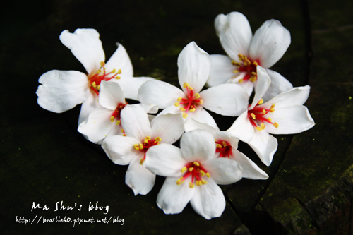 好失望...只好撿路邊掉落的桐花跟麻糬拍張照囉!